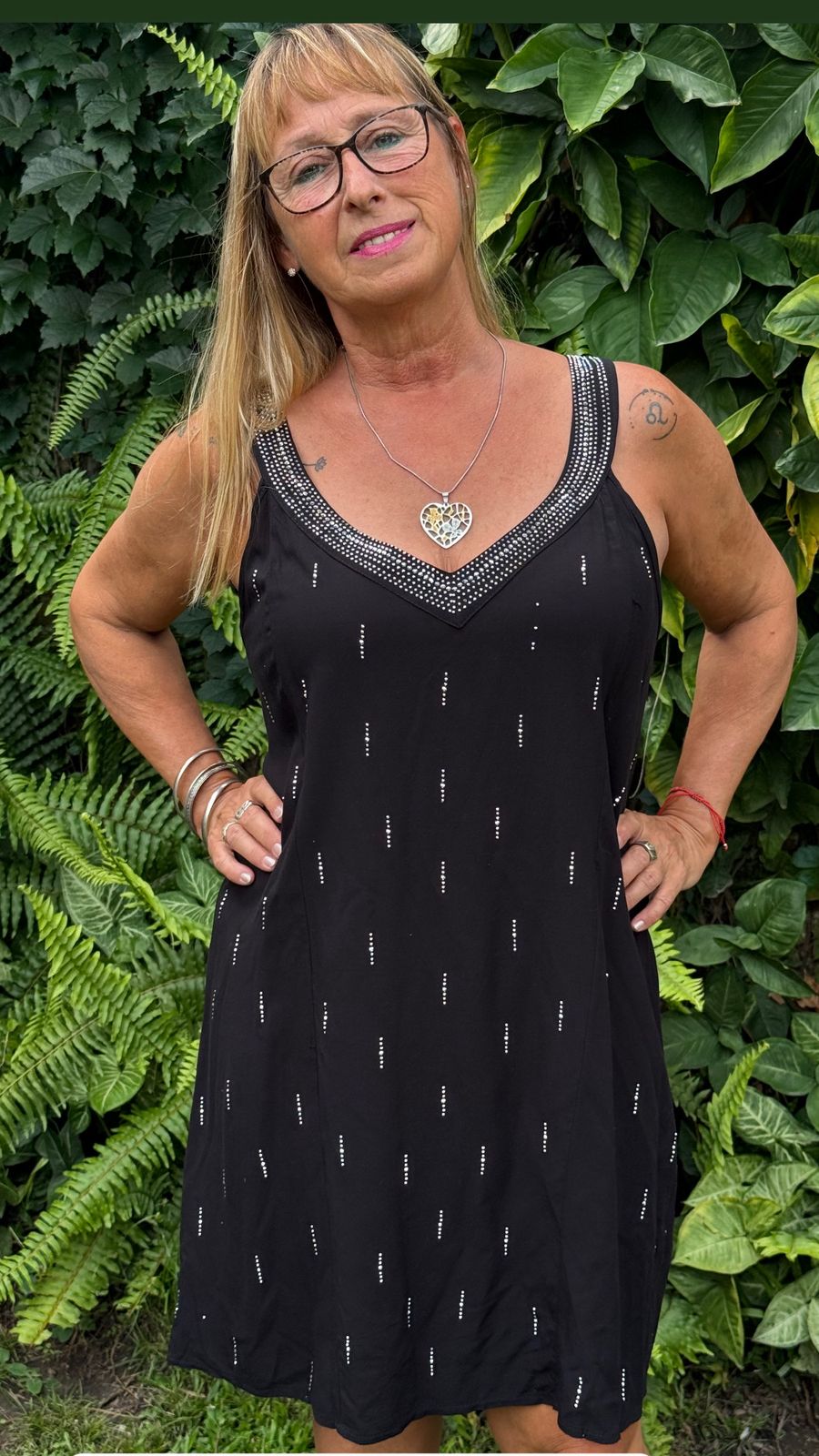 Vestido de fibrana fresco y elegante con detalle de brillos. Da para un talle 5/6