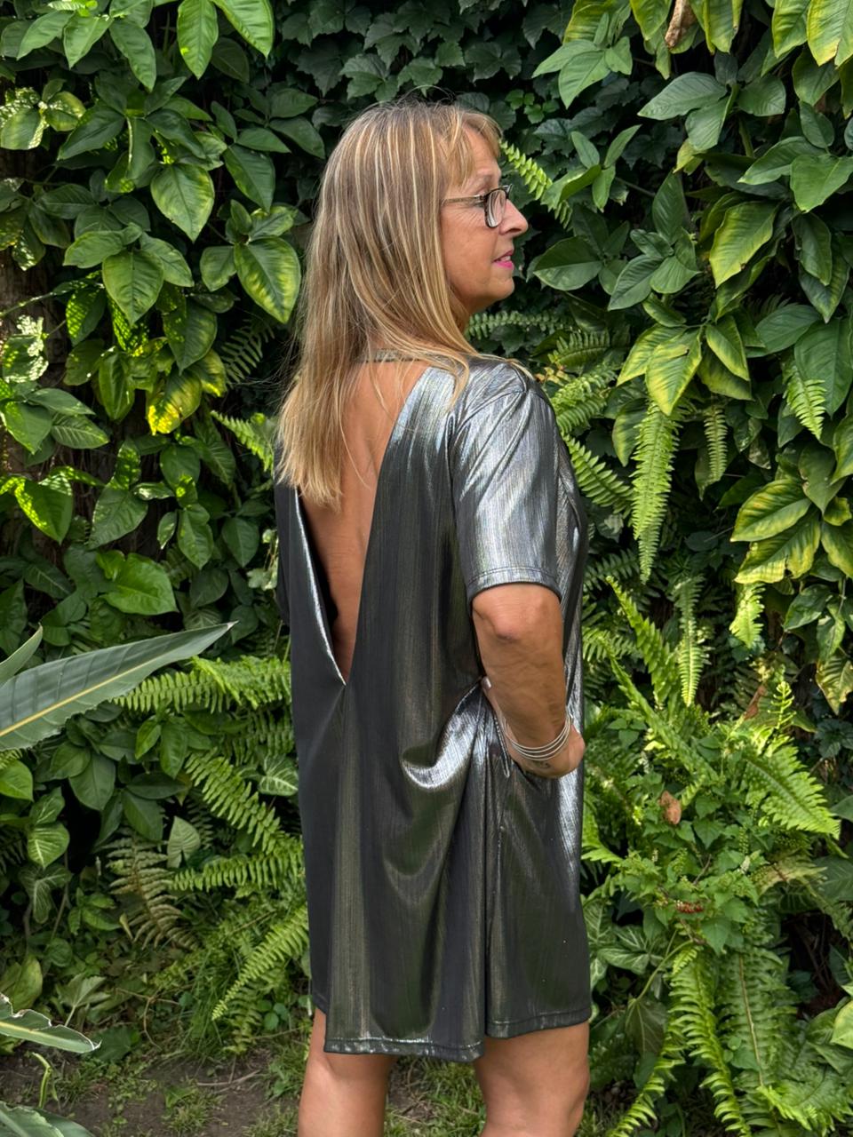 Vestido corto con mangas y detalle en la espalda. Da para un talle 5/6
